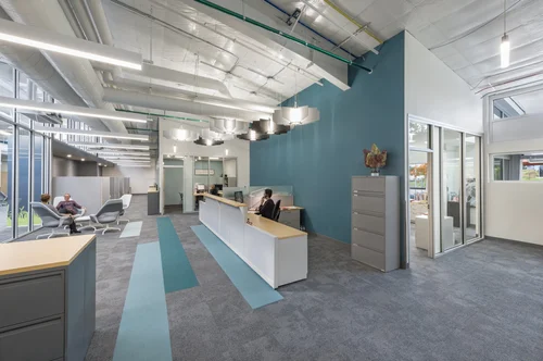The College of DuPage Administrative Building Remodel is the renovation of a 22,500 SF pre-engineered steel building into an administrative center, relocating several of the College’s departments from aging facilities at the main campus. The building will have customized suites for multiple administrative departments for the College, with each suite each functioning autonomously, with their own conference rooms, supply rooms, and offices. To encourage collaboration and interaction between these administrative programs, shared core spaces are provided, such as a lounge areas in main corridors, a fifty person conference room, and shared break room. These suites are located within the building according to the amount of visitors they are expected to receive, with Procurement Services located near the main entrance, and more private suites such as Planning and Research located near the rear entrances.