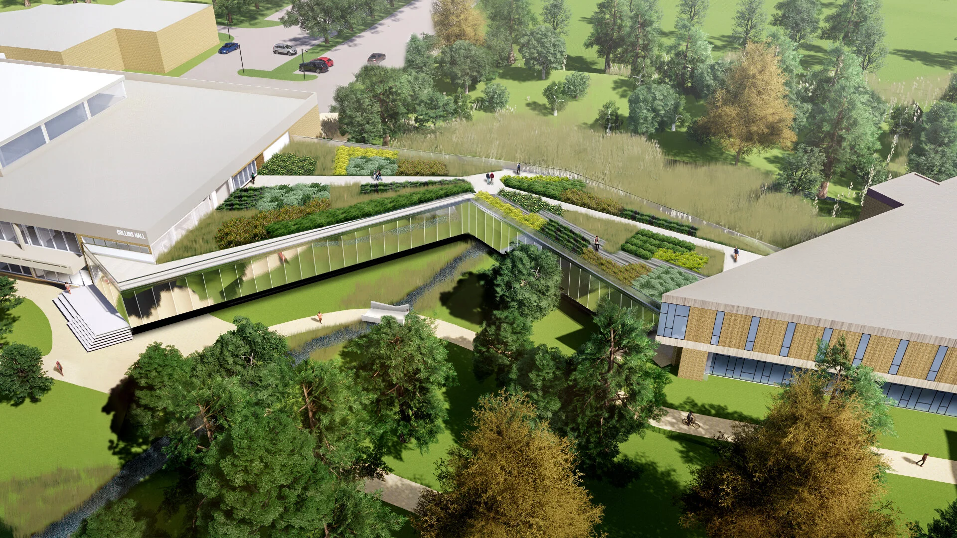 The Waubonsee Community College Student Life Link was an open invitation to submit a design proposal for a new student center that would double as a connection from the College’s cafeteria across an undulating field to the campus library. The “Convergence” design proposal is an attempt to sustain the existing campus landscape while simultaneously highlighting its features to strengthen the spatial experience of the addition. The solution is a single-story building that creates a bridge from the existing campus buildings, floating over an existing flood plain that sustains a protected grass wetland to the north and maintaining the existing rolling field. The angular shape of the building is a response to the assemblage of trees immediately to the west, which creates a geometry that allows a constant distance from the trees while also highlighting them as a feature of the building, placing them as a backdrop for program to take place. The geometry of the building also directs thoroughfare inside the building to campus landmarks, such as the lake to the southwest, and a tree line to the northeast. The College had concerns about the addition being too dominant visually. In response, the facade is reflective to minimize the buildings impact on the quad. In combination with ceramic frit, the building has a varied character depending on the direction of approach experienced.
